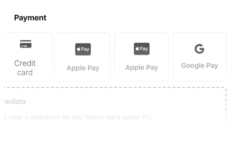 Cakto accepts the major digital wallets: Apple Pay, Google Pay, PayPal and Samsung Pay, all natively integrated at checkout.